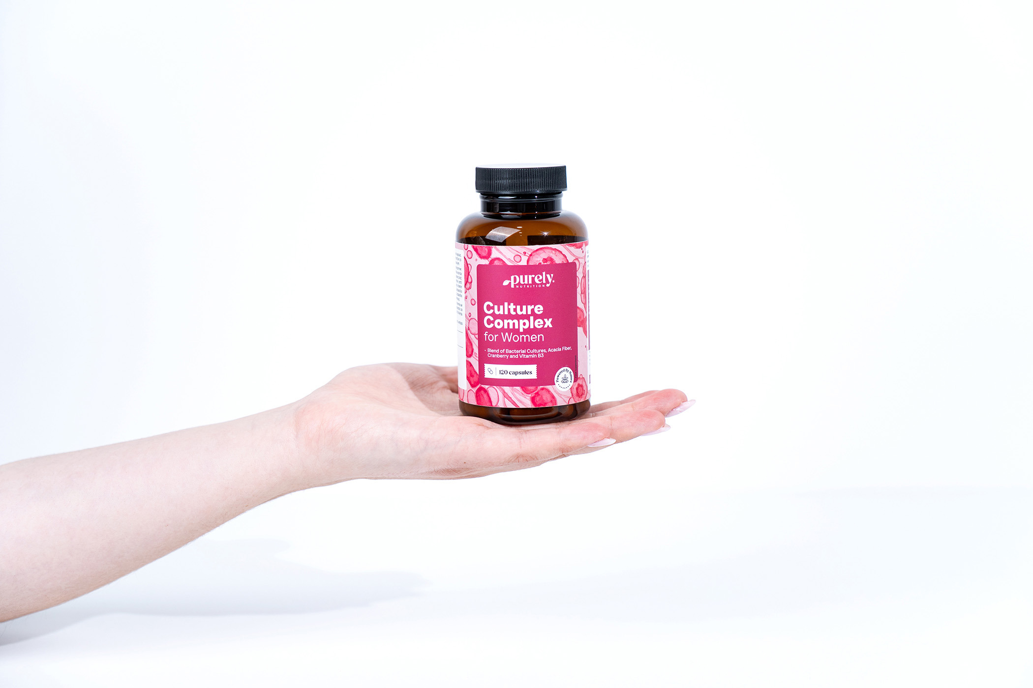 Összetevők: akáciarost, térfogatnövelő anyag: cellulóz, hidroxipropil-metil-cellulóz (HPMC; növényi kapszulahéj), szárított vörösáfonya kivonat (Vaccinium macrocarpon; gyümölcs; standardizált 50 % proantocianidinek), csomósodásgátló: zsírsavak magnéziumsói, niacin (B3-vitamin), baktériumkultúra-keverék 500 milliárd/g (Lactobacillus acidophilus, Lactobacillus casei, Lactobacillus crispatus, Lactobacillus gasseri, Lactobacillus plantarum, Lactobacillus rhamnosus).